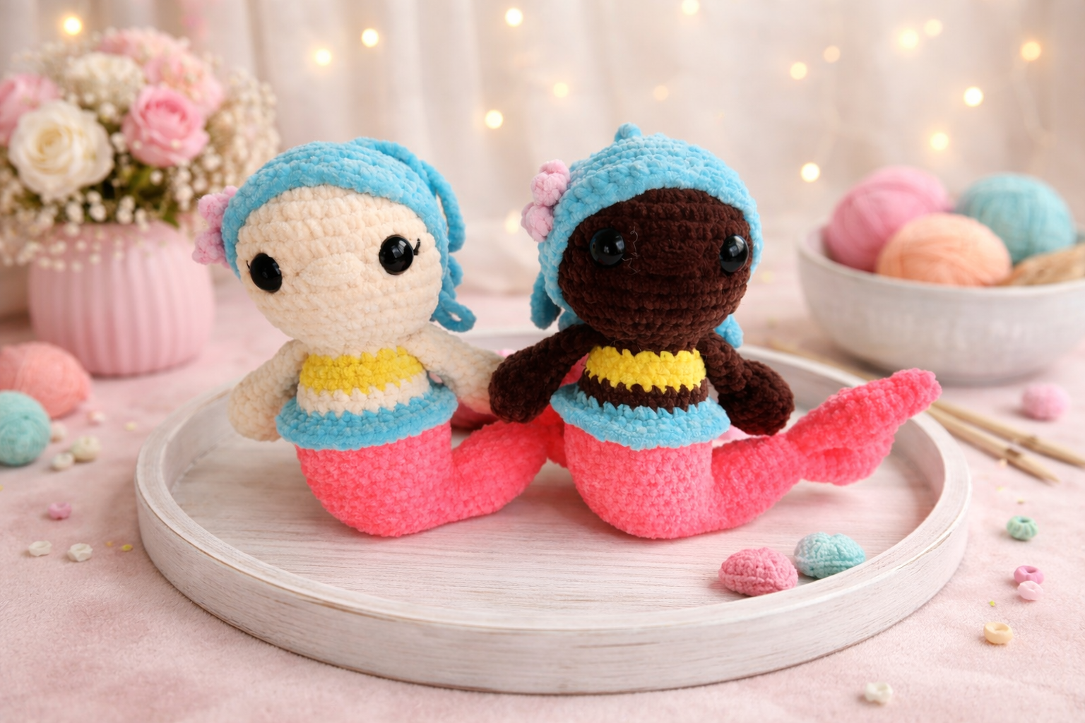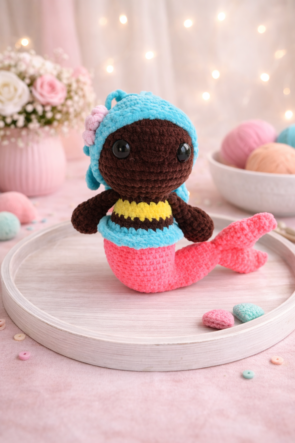 Sweet and fun crochet mermaid ready for fun, imaginary sea adventures!